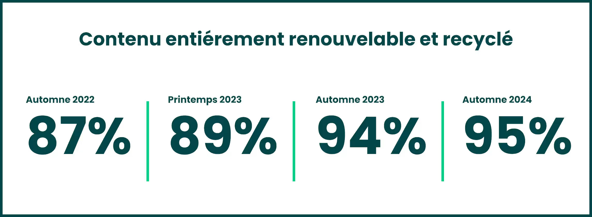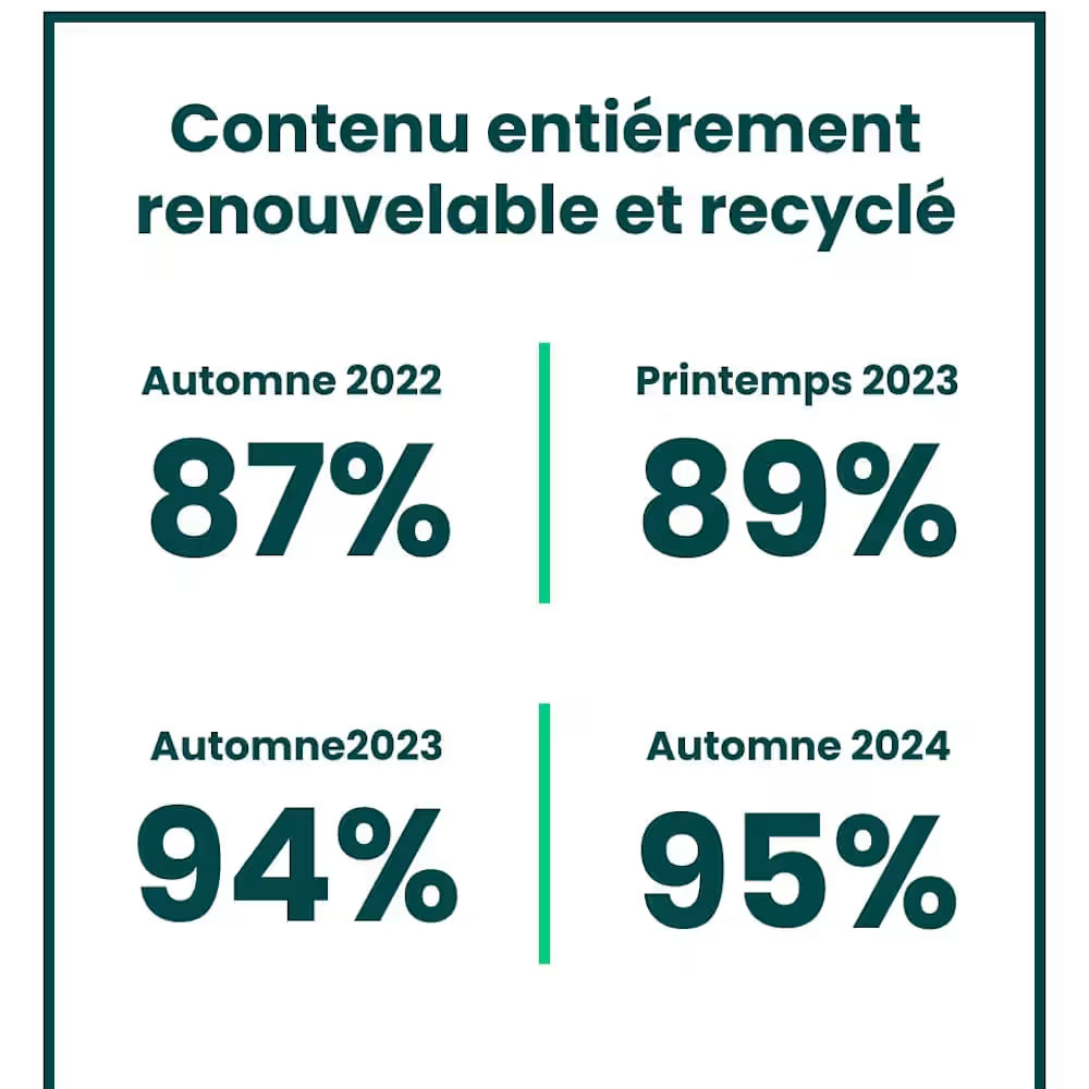 Notre stratégie pour utiliser seulement des matières régénératrices, recyclées ou de sources éthiques s’appuie sur plusieurs initiatives clés. Par exemple, établir des partenariats visant à éliminer les emballages non nécessaires et de nous engager à éradiquer les plastiques à usage unique dans nos emballages d’ici 2025. Nous convertissons aussi nos fibres synthétiques vierges en fibres recyclées, en vue de soutenir notre engagement à l’égard du développement durable sans compromettre la résistance et la performance de nos produits.