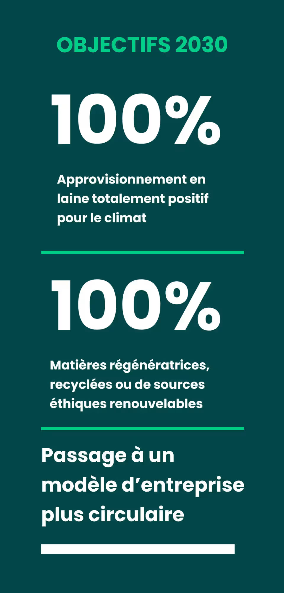 Smartwool s'engage à bâtir un avenir plus durable. C’est pourquoi nous avons établi un objectif ambitieux pour 2030 : assurer un approvisionnement en laine totalement positif pour le climat, n’utiliser que des matières régénératrices et créer des produits de fabrication entièrement circulaire. Nous croyons que ces pratiques sont essentielles pour réduire notre empreinte environnementale et rendre la planète plus résiliente. En choisissant de fabriquer la laine de manière positive pour le climat, nous pouvons en fait neutraliser notre empreinte carbone. En utilisant des matières régénératrices, nous favorisons des écosystèmes sains et appuyons les éleveurs de moutons qui produisent de la laine mérinos en contribuant à préserver nos ressources naturelles. Et en concevant des produits de fabrication circulaire, nous sommes en mesure de réduire le gaspillage et de prolonger l’utilisation de ressources précieuses.